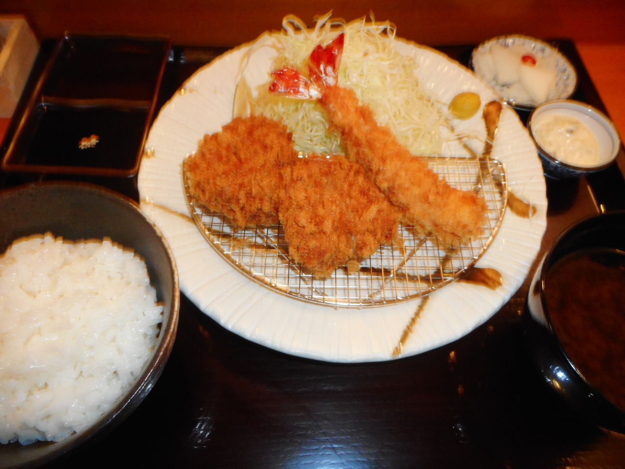 ロースかつとヒレかつとエビフライを頂きましたが、どれもサクサク!