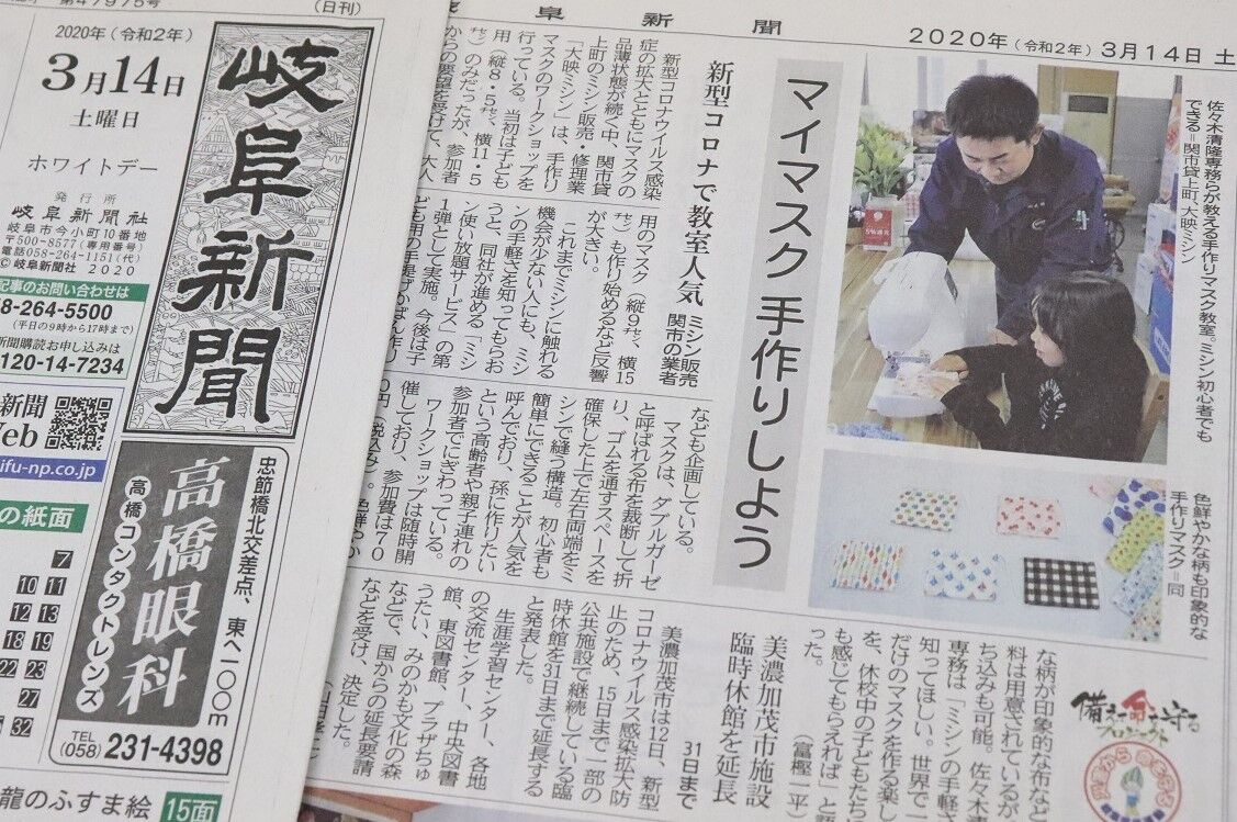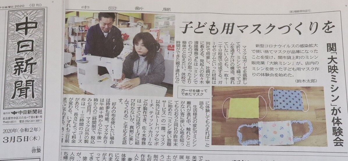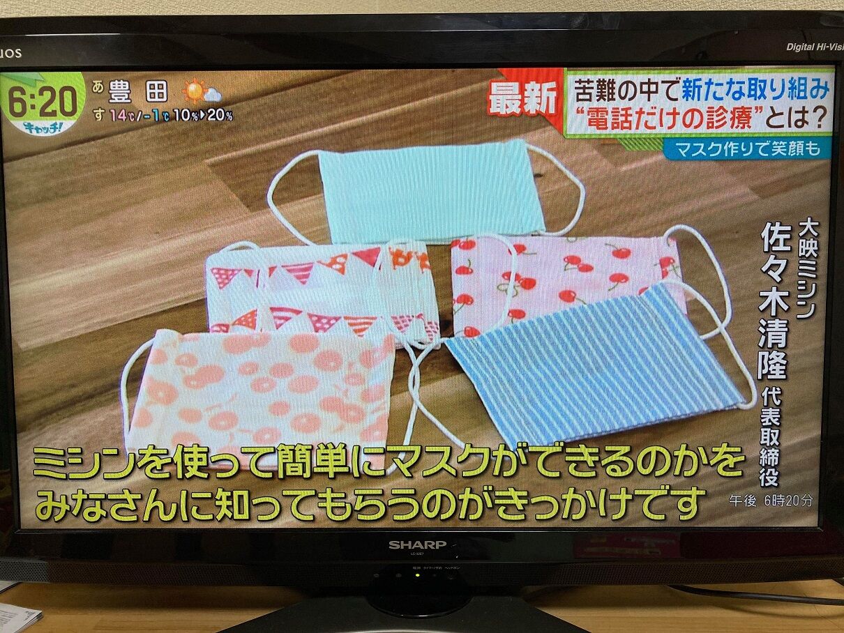 マスク不足の中、注目を集めている大映ミシンの『子ども用マスク作りワークショップ』。昨日の中京テレビ『キャッチ』でも取り上げられました!