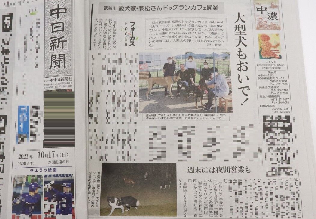7月のオープンから順調にファンを増やしているドッグカフェ『café mof(カフェモフ)』(関市武芸川町)が、10月17日(日)の中日新聞に大きく掲載されました!