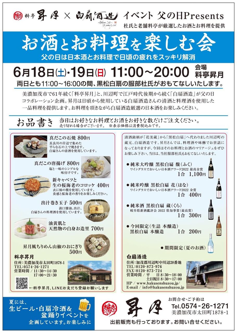 父の日イベントとして、「料亭昇月」(美濃加茂市)が「白扇酒造」(川辺町)とコラボした新たな取り組み、『お酒とお料理を楽しむ会』を今週末6/18(土)- 19(日)に開催します!