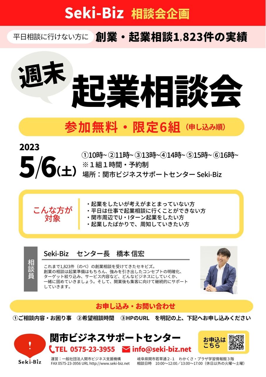ぜひご参加くださいね♪ これまで1,823件(のべ)の創業相 談を受けてきたセキビズ。 「何から始めたらいいの?」 「どう進めていけばいい?」 「漠然としたアイデアをどう事業に落とし込めばいい?」 という構想段階の方から、創業したばかりの方まで、開業前も開業後も、集客に向けて無料で継続的にサポートしていきますよ! 起業を考えたら、まずはセキビズへ☟ セキビズ公式ホームページ 「週末起業相談会」の詳細・お申込みはこちらから☟ 詳しくはこちら