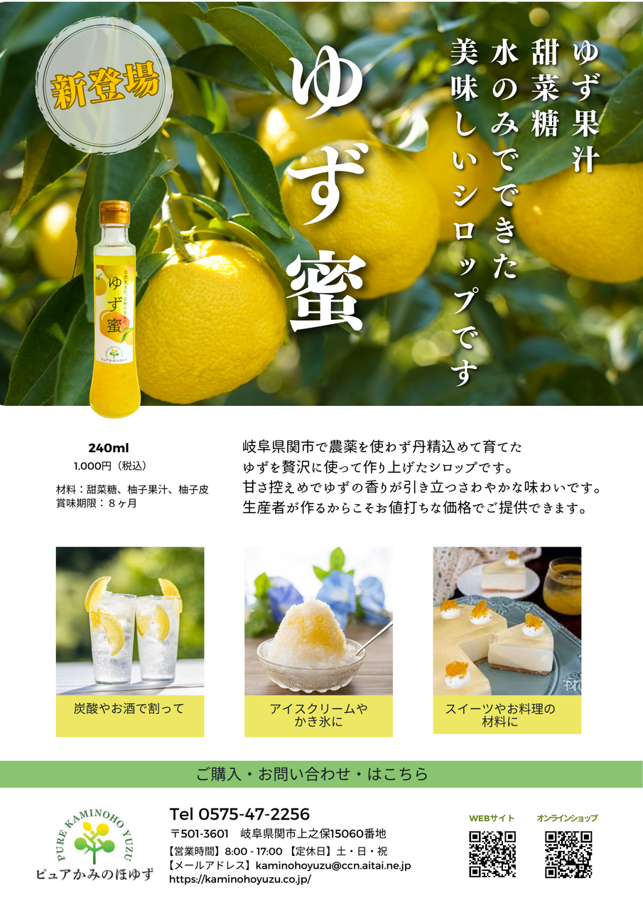 関市上之保にある「かみのほゆず株式会社」から、ゆずの果汁をたっぷり詰まった爽やかな味わいのシロップが販売されました!
