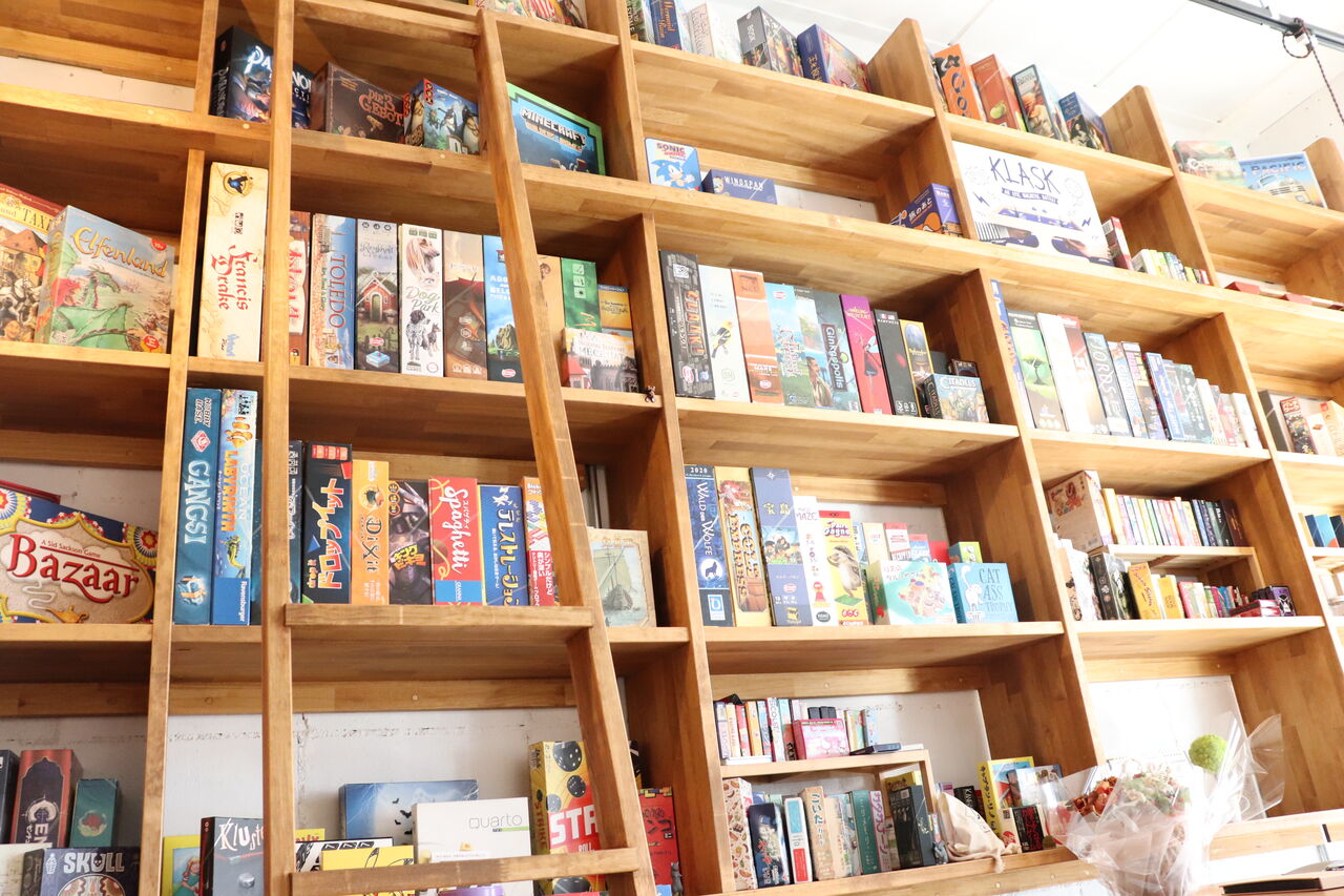 そんな荘加さんのお店の扉を開けると、最初に目につくのは壁一面の大きな棚にびっしりと並んだ約280種類のボードゲーム。