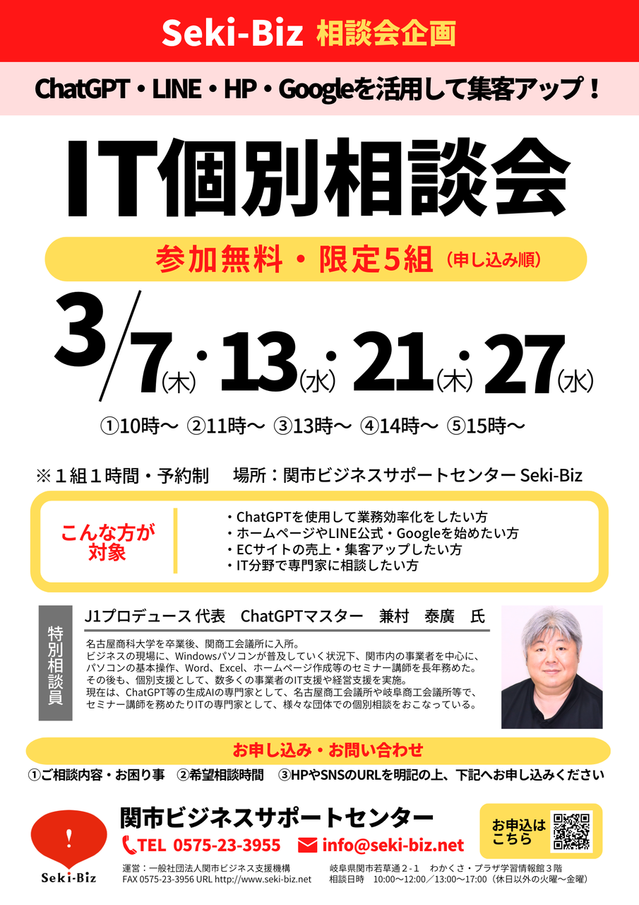 「自分の事業をもっとインターネットでPRしたい」 「SNSやホームページを作って集客・売上アップしたい」 「LINEやGoogleの登録をしたい」 という方、IT個別相談会で集客・売上アップに向けて相談してみませんか? 講師はJ1プロデュース代表でChatGPTマスターの兼村泰廣氏。 名古屋商工会議所や岐阜商工会議所などでセミナー講師を務めたり、IT専門家としてさまざまな団体での個別相談をおこなっています。 5組限定で各1時間ずつの個別相談会で、各社に合ったアドバイスが受けられます。もちろん参加は無料です。 ◆日時 3/7(木)・13(火)・21(木)・27(水) ①10時~②11時~③13時~④14時~ ⑤15時~ (※ご予約日・時間は先着順にご希望時間のご予約となります。) ◆場所 関市ビジネスサポートセンター ◆定員 限定5組(申込順) ◆こんな方が対象 ・ホームページやLINE公式・Googleを始めたい方 ・ECサイトの売上・集客アップしたい方 ・IT分野で専門家に相談したい方 皆様のご予約お待ちしております。