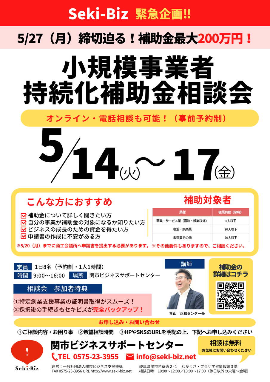 【日程】 5/14(火)・5/15(水)・5/16(木)・5/17(金) 【時間】 9:00~16:00 【開催場所】 関市ビジネスサポートセンター・またはオンライン・電話相談 【こんな方にオススメ】 ・補助金について詳しく聞きたい方 ・自分の事業が補助金の対象になるか知りたい方 ・申請書の作成に不安がある方 ※5/20(月)までに商工会議所へ申請書を提出する必要があります。 参加希望の方はセキビズまでご連絡ください。 相談会参加者には ①特定創業支援事業の証明書取得がスムーズ ②採択後の手続きもセキビズが完全バックアップ! ぜひ、この機会にセキビズにご相談ください! ■申込はコチラ☟ ココから見る ■小規模事業者持続化補助金の詳細はこちら☟ ココから見る