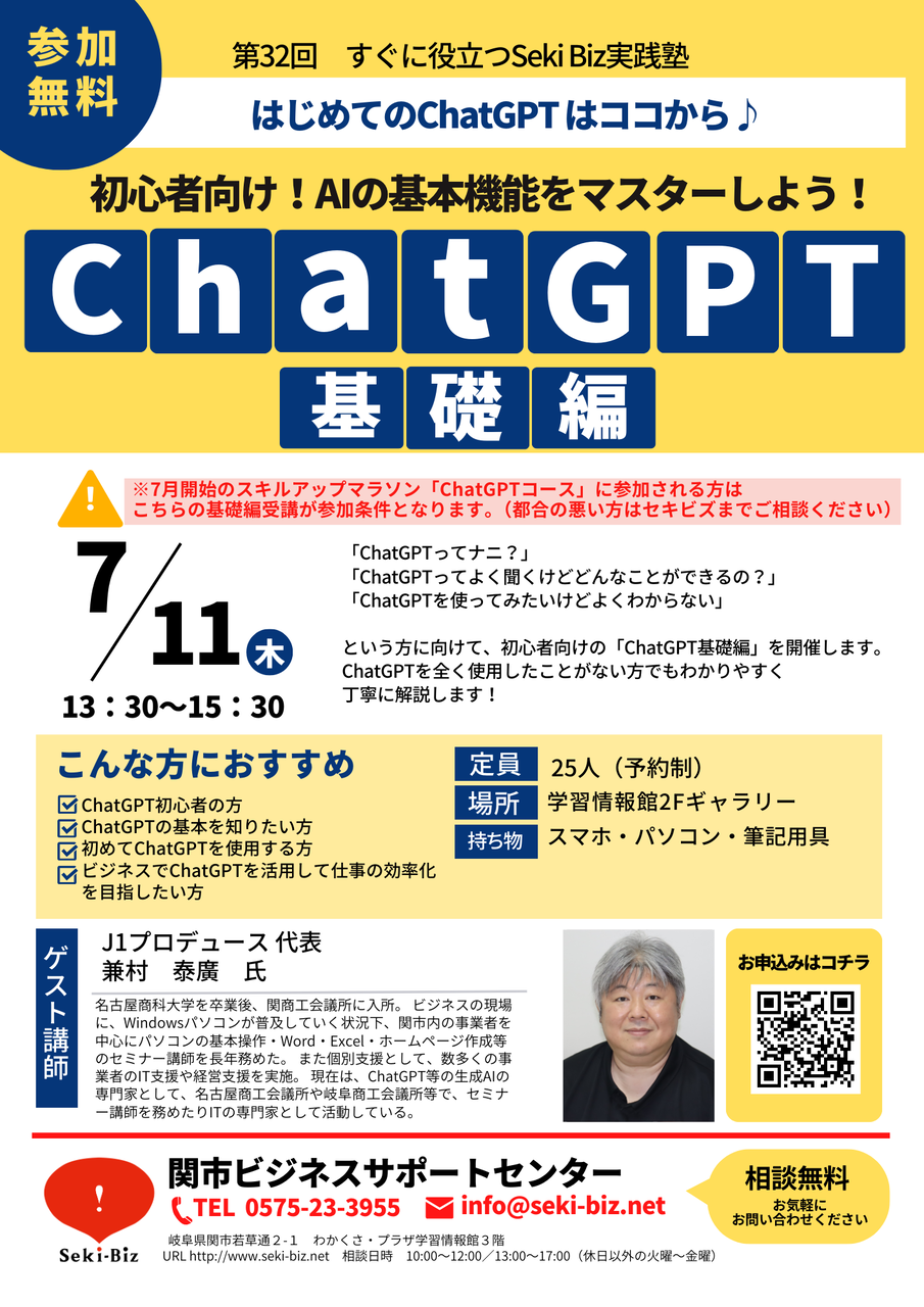 「わからない事を検索するために使っていたchatGPTでしたが、友達のように会話して相談していくアイテムなんだとわかりました!」 「事業への活用方法がよく分かりました。」 とChatGPTがより身近になり、皆様の事業に実践できる充実した内容になりました! 今回で第29回SekiBiz実践塾スキルアップマラソン「ChatGPTコース」の全3回コースは終了しましたが、大好評につき7月から第2弾も開催いたします!
