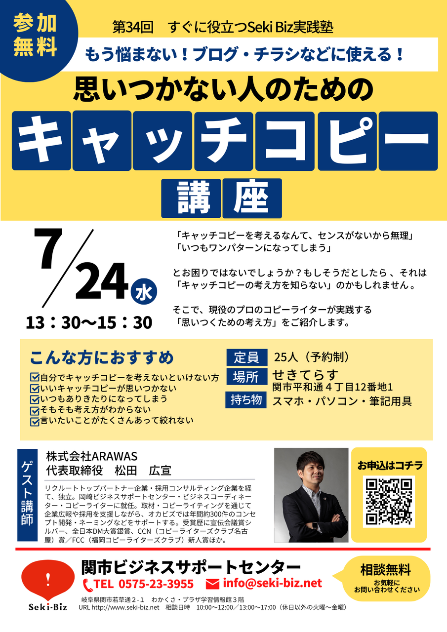 ◆こんな方が対象 ・自分でキャッチコピーを考える方 ・いいキャッチコピーが思いつかない方 ・いつもありきたりになってしまう方 ・そもそも考え方が分からない方 ◆日時 2024年7月24日(水) 13:30~15:30 ◆定員 各回25名(お申込み順) ◆場所 せきてらす →場所を見る ◆お申込方法 Googleフォームからのお申込み →ココから見る ◆期限 定員になり次第受付終了 <持ち物> ・スマホやパソコン・筆記用具 ※充電用のコンセントや電源のご用意はございませんので、事前に充電をお願いいたします。 ※ご参加は岐阜県内の事業者に限定させていただきます。 ■詳細はコチラ☟ ココから見る