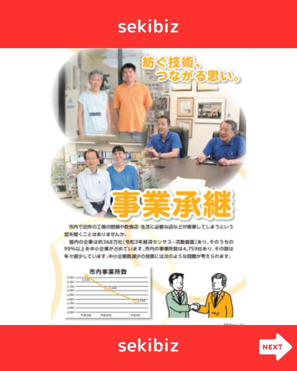 ~事業承継について考えてみませんか?~ ・親族内継承 ・第三者継承 ・従業員継承 など今月号はトップページにて3名様の事業承継インタビューが記載されています! そのうち岡田さん・船木さんは実際にセキビズへ相談に来られ、事業承継を実現しています。