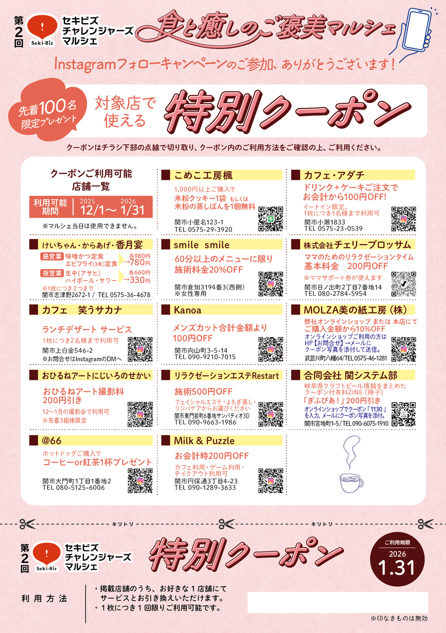 先着100名様に「関市内の飲食・サービス・物販で使える割引クーポン券」をプレゼント♫