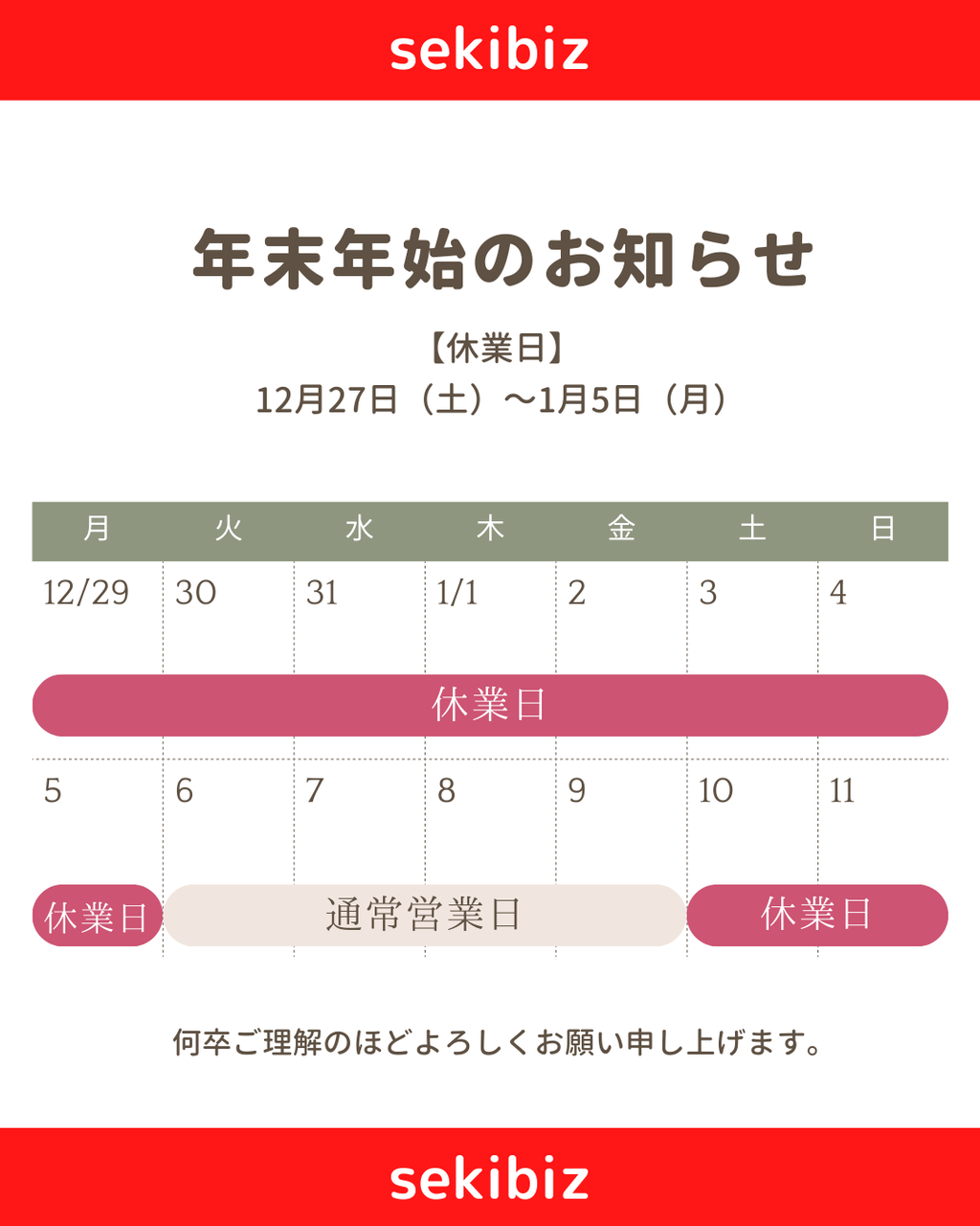 さて、セキビズは12月27日(金)~1月5日(月)までお休みをいただきます。